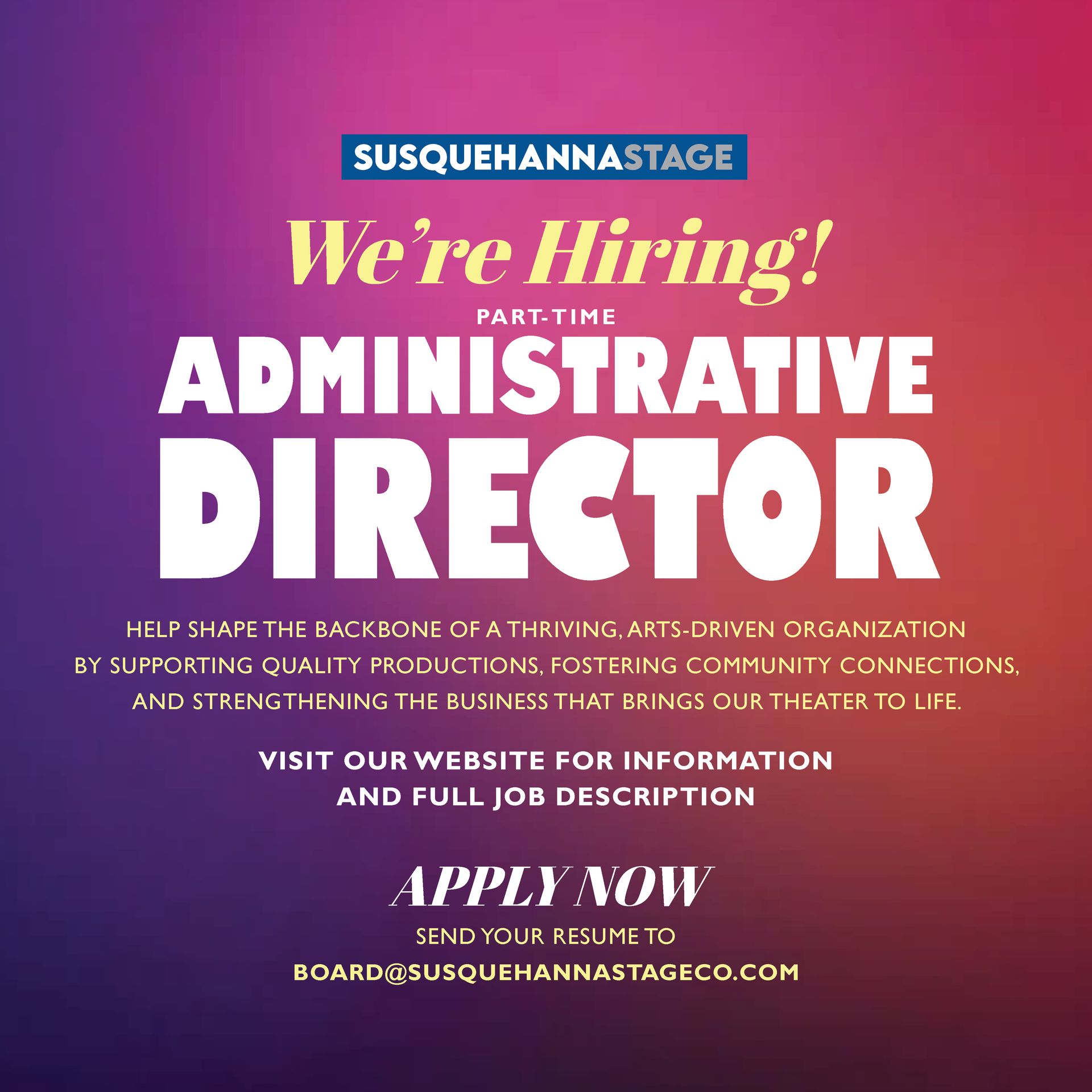 Susquehanna Stage is seeking a part-time Administrative Director to help shape the backbone of a thriving, arts-driven organization and strengthening the business that brings